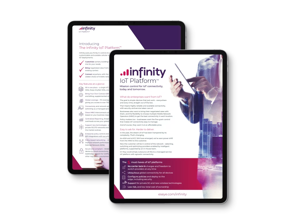 Learn more about Infinity IoT Platform™, our single, customisable and scalable cellular network for all your global IoT deployments.