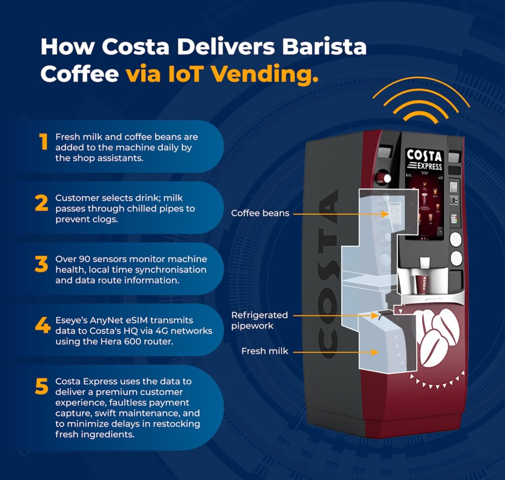 Costa Express machines are fitted with, Eseye’s Hera 604 IoT router and AnyNet+ SIM which work together hand-in-hand. The Hera router supports multiple radio-access types (RAT), including 3G, 4G/LTE, and Wi-Fi. Eseye’s AnyNet+ SIM connects to any mobile network, enabling cellular data access and immediate communication with back-end systems upon machine activations through our access to over 800 mobile networks in 190 countries.