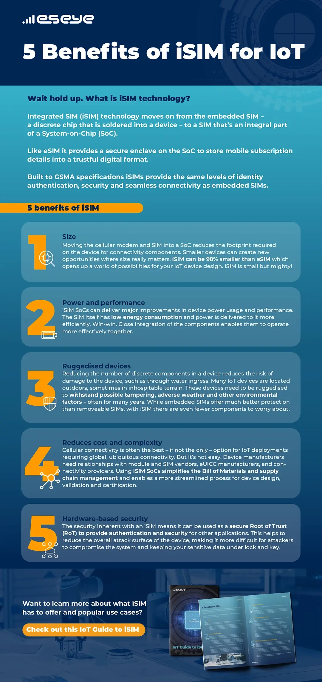 Initially, iSIM technology builds on the foundations of the eSIM solution to provide seamless, flexible connectivity with the highest levels of security and reliability. Combined with reduced size, efficient power usage and high performance, iSIMs open up countless possibilities for enhancing existing applications and bringing cellular connectivity as a viable option for a whole host of new use cases, applications and devices.