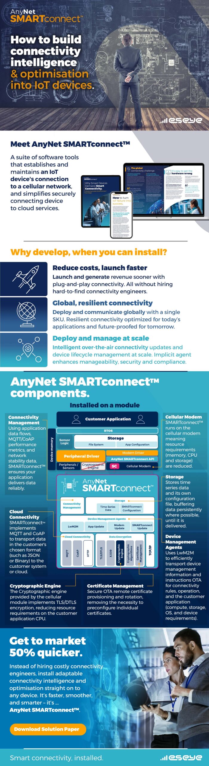 You could hire a world-leader in IoT connectivity firmware. Or you could install it… Meet AnyNet SMARTconnect™: flexible, on-device connectivity software that enables resilient and scalable global connectivity. Here is an infographic that takes you under the hood of the AnyNet SMARTconnect™ technology and explores its key technical components.