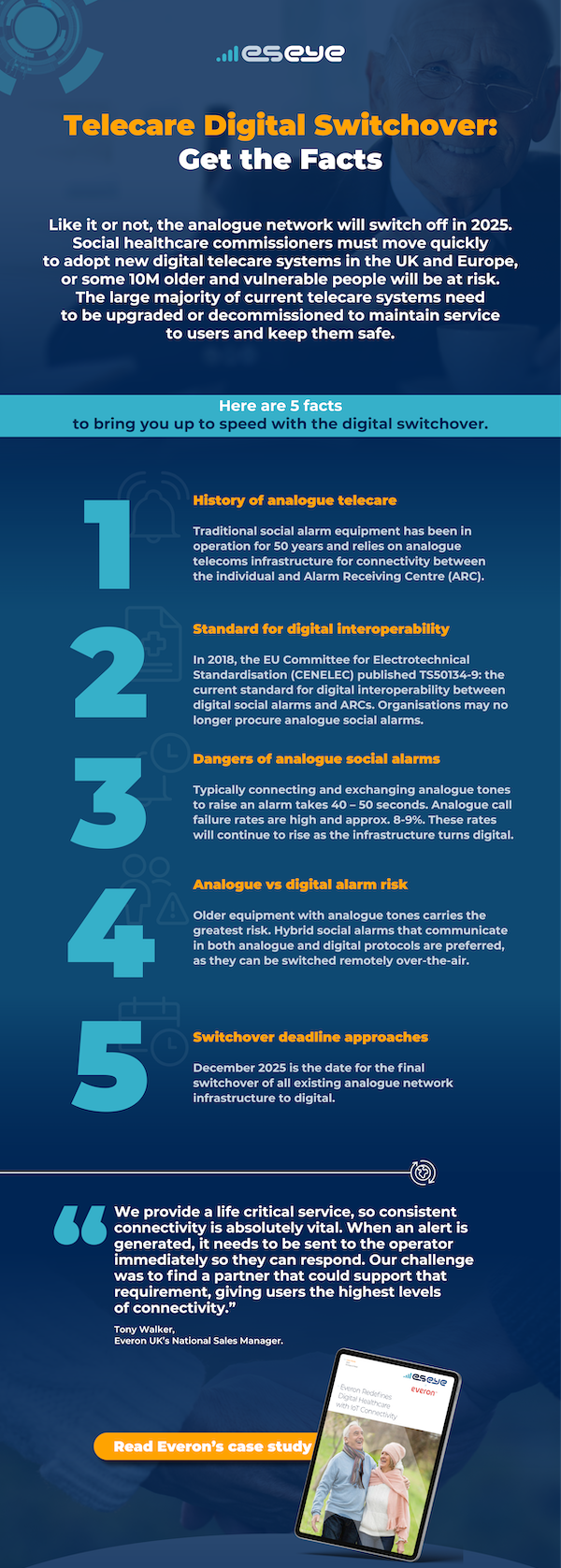 The way telecare devices connect is changing. All existing analogue networks will be converted to digital by December 2025. This means that a large majority of telecare systems and social alarms must be upgraded or decommissioned to maintain service for users and keep them safe.