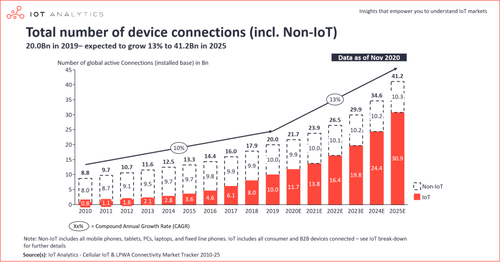 By the end of 2020, there were 21.7 billion active connected devices worldwide. For the first time, the number of IoT connections (such as smart home devices and industrial equipment) exceeded the number of non-IoT connections (such as smartphones and computers). The demand for IoT continues to grow, with the number of connected IoT devices estimated to reach nearly 31 billion in 2025.