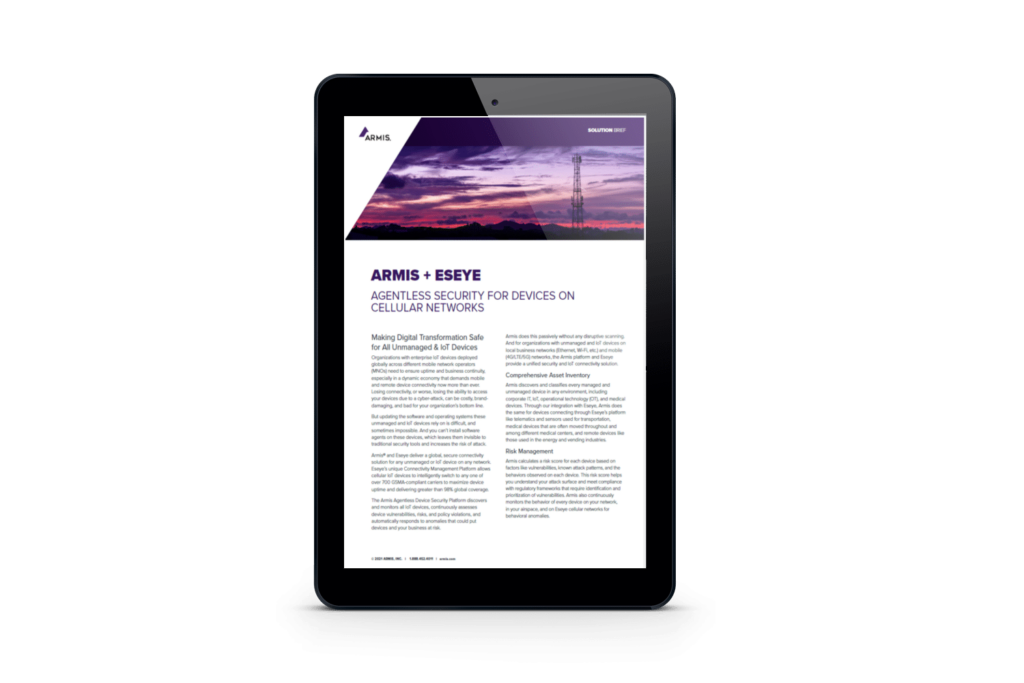 Armis® and Eseye have joined forces to deliver a global, secure connectivity solution for any unmanaged or IoT device on any network. Learn more about our joint solution.