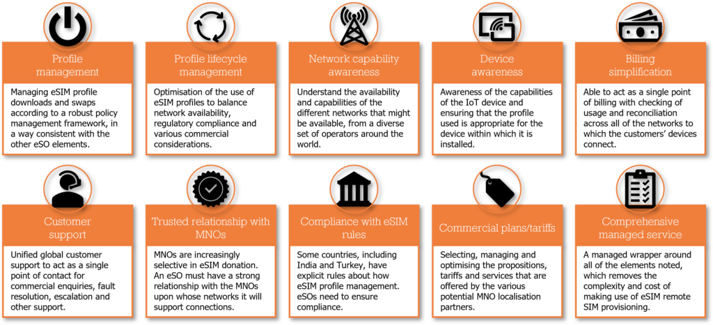 This new ‘eSIM Orchestrator’ function, would specialise in managing the complexities of this new environment. According to the paper, key responsibilities and characteristics of such a role would include: